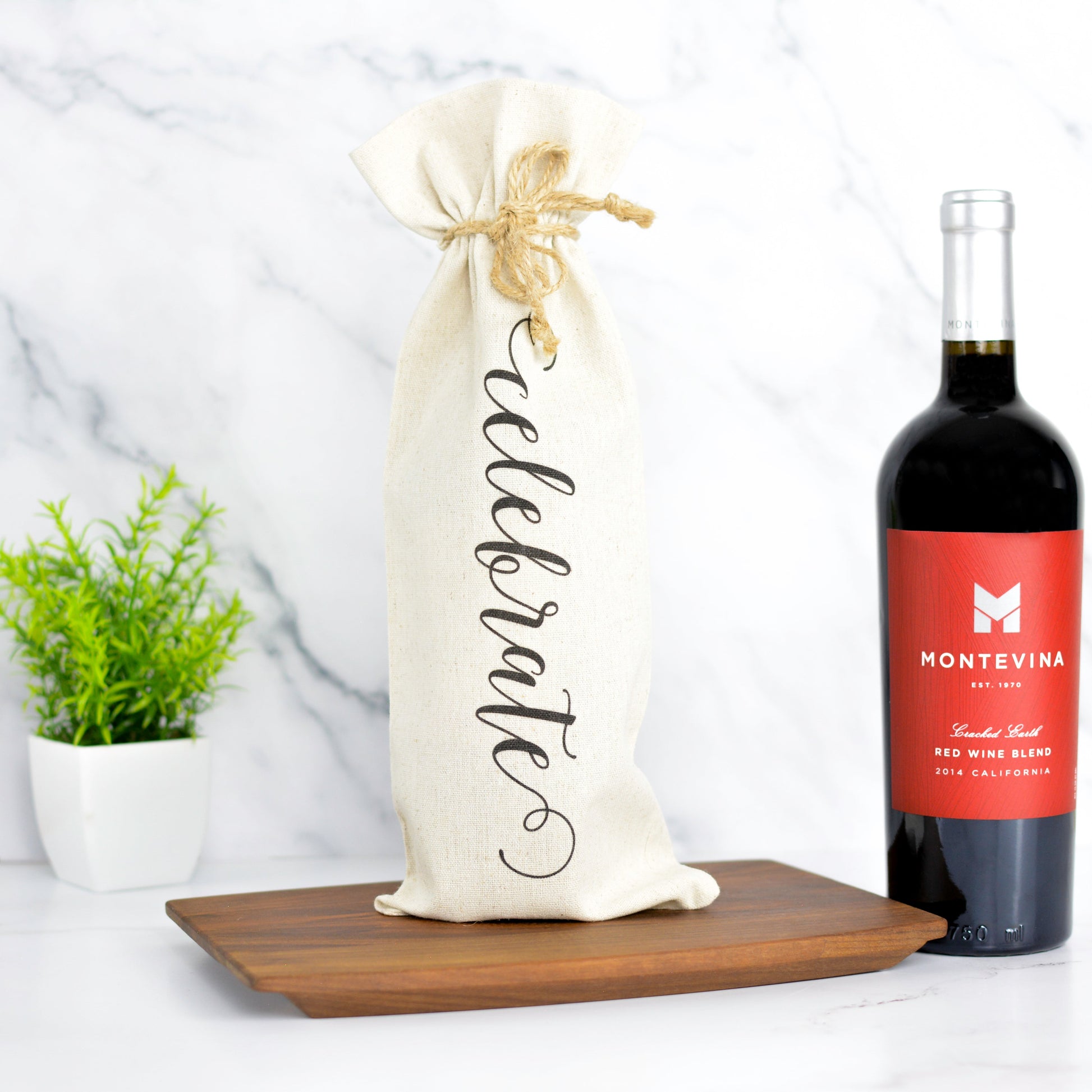 A natural cotton wine bag with a rustic twine tie, printed with the word “celebrate” in stylish script