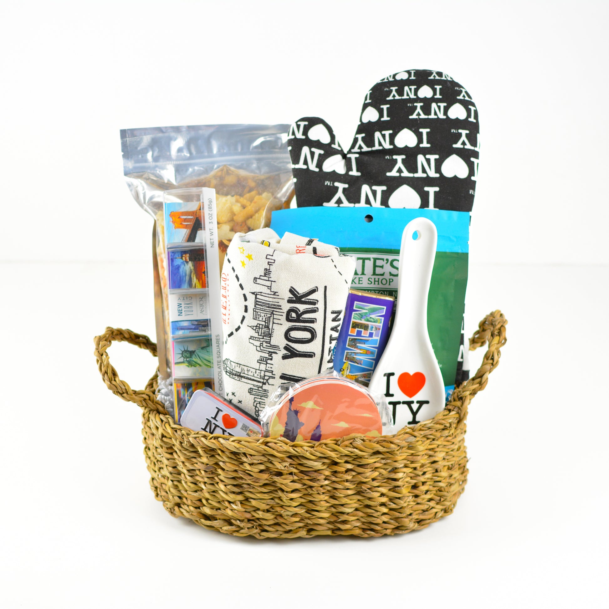 The gift is a delightful assortment that includes a New York-themed oven mitt, a variety of mouth-watering cookies, decadent chocolate, and a charming spoon rest. This carefully curated collection is perfect for anyone who enjoys baking or simply indulging in delicious treats.spoon rest, cookies.